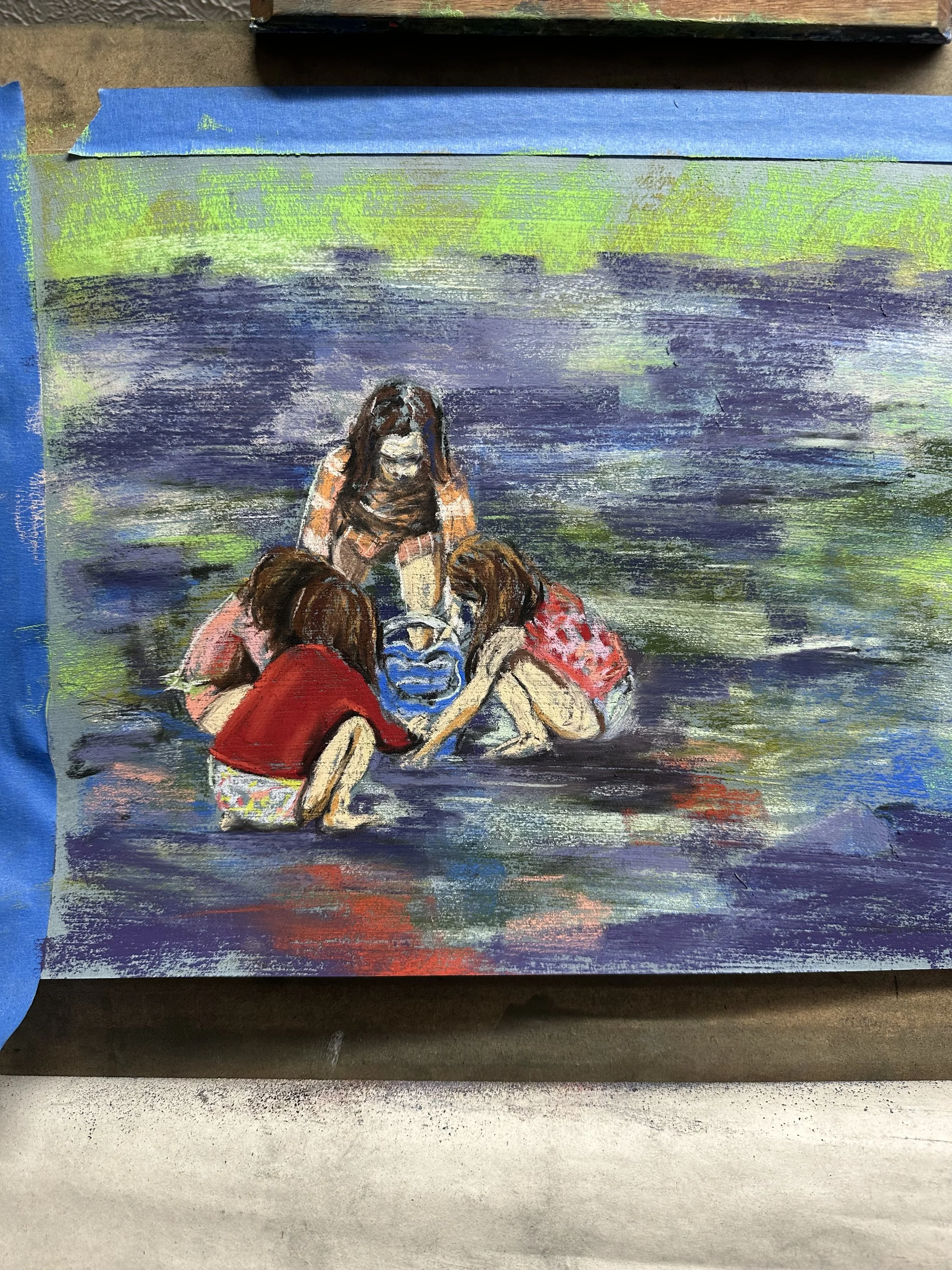 This is a pastel I’m working on of my daughters and a couple of their friends playing with a bucket of leeches when we were in Doerr County last year.