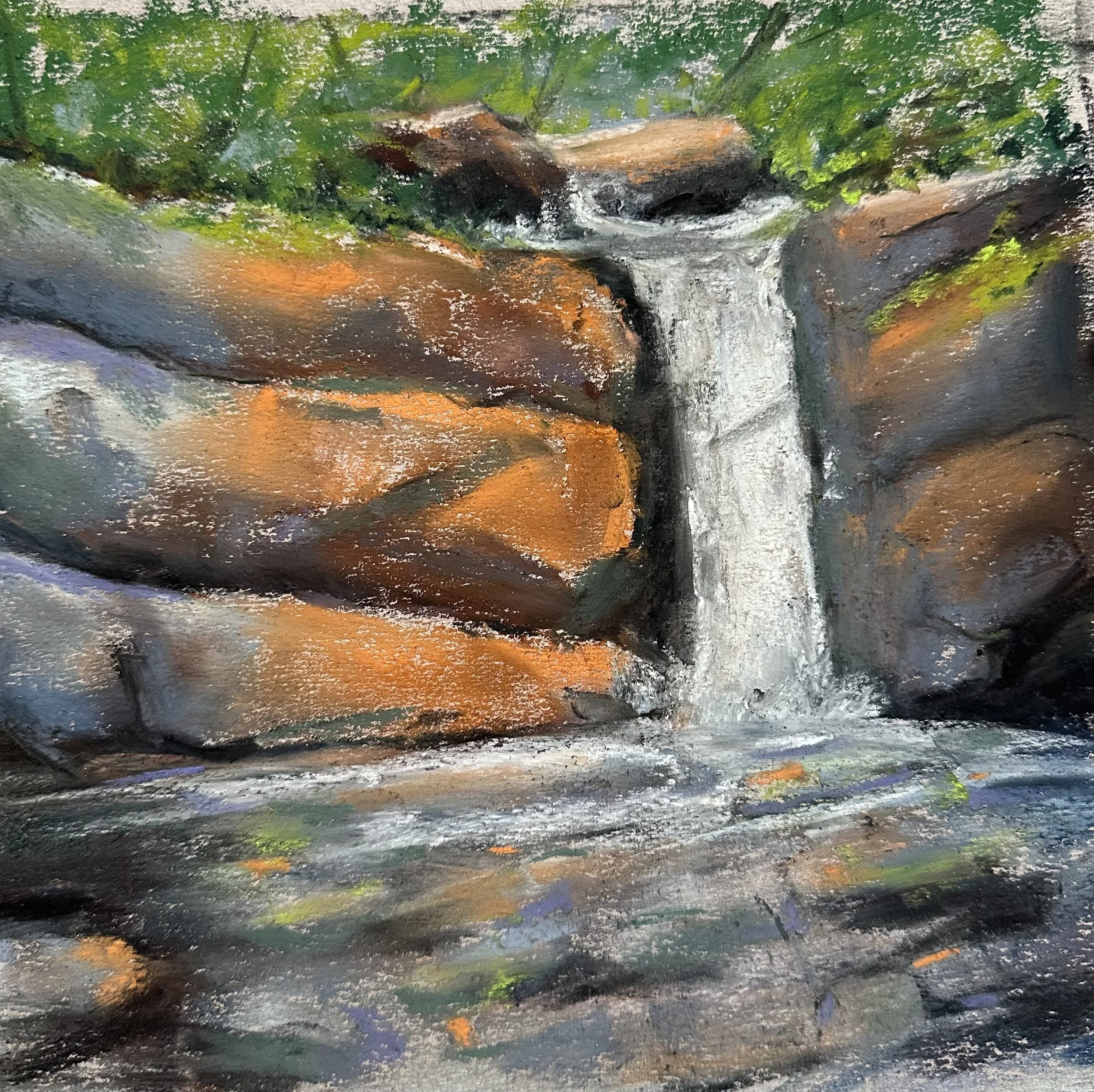 Woke this morning to catch the sunrise on the Three Sisters mountains in Alberta but it was overcast, so it was a bust. But I painted this waterfall from our hike at Lake Louise a few days ago instead.