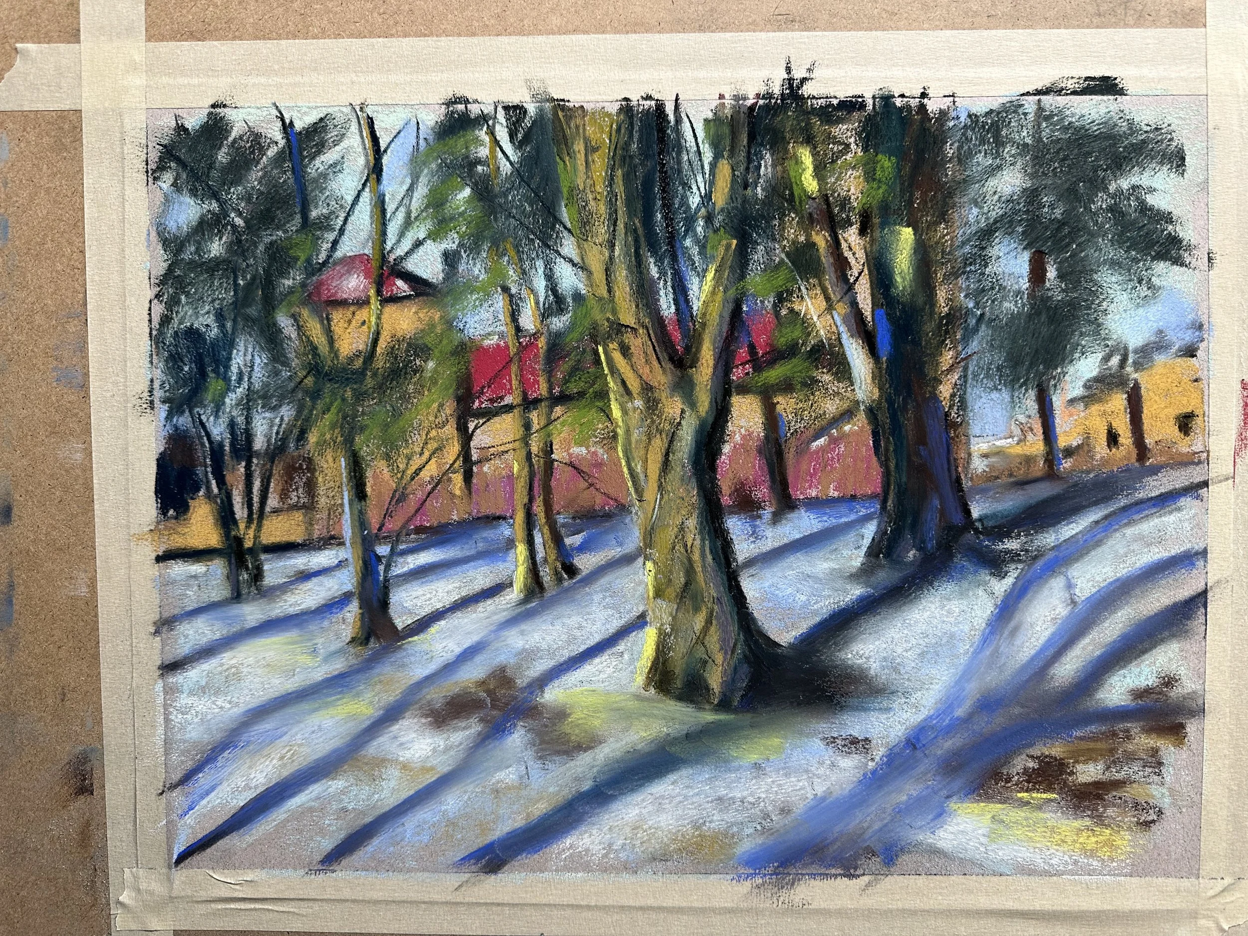 I don’t paint a lot of architecture, and I’m starting to get tired of just painting dead trees, so I’m looking to Albert Handell for inspiration again. This is a study done from his painting “The Scottish Rite Temple.” In his book Intuitive Light, Handell shows this painting while talking about shadows and how they are affected by light in various situations. I’m currently working on a talk for this subject to give to the Northern Indiana Pastel Society at some point in January or February of 2026. I don’t plan to make this a finished painting (it’s not really my composition), but this was a helpful exercise to see what he did with the shadows in various places. One of the things that is notably different between his original and mine is that the ground plan in mine is much curvier, and part of the reason is that I took a photo of painting and the page was curved. It affected the way I painted the cast shadows of the trees outside the frame and I hadn’t even intended for that to happen. He also painted on sanded board, and I did this on mi-teinte paper that I put a coat of gessoe on in order to give it some more tooth. I do this sometimes now in order to use the mi-teinte paper rather than do studies on my better papers while still getting a rougher surface to work on. I have found that the gessoed surface doesn’t really take the Diane Townsend terrages very well, and that it eats up my Terry Ludwigs too. The unisons I use on the gessoed surface work great and so do my rembrandts (those are my workhorses currently, and I’ve been pleased with them).