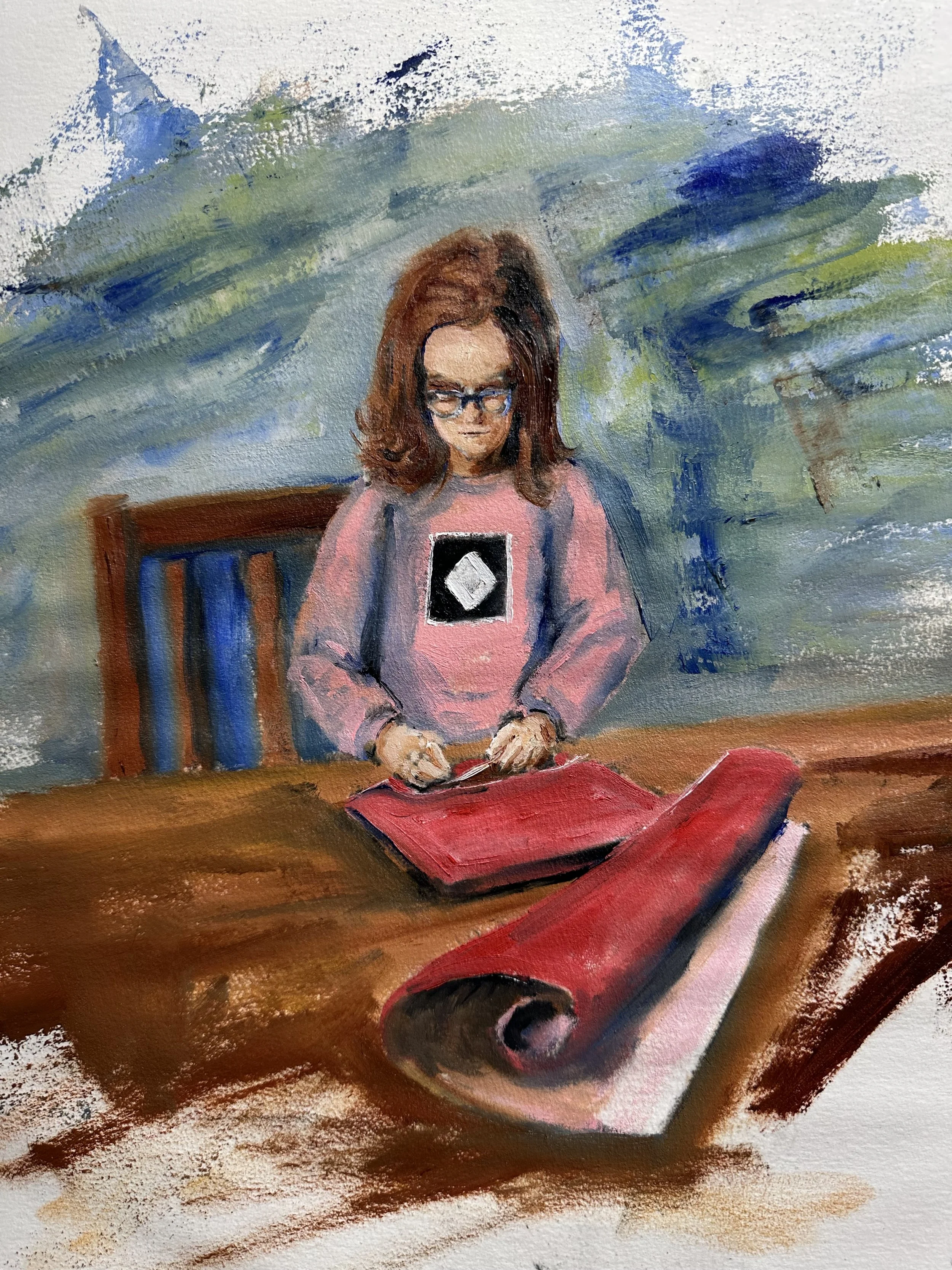 I’m still painting landscapes and portraits. The following is not complete, but it’s of my oldest daughter wrapping her grandma’s bday gifts. I did it in oil because it’s small and I can’t do small things with any detail in pastel, at least not in a way that pleases me.