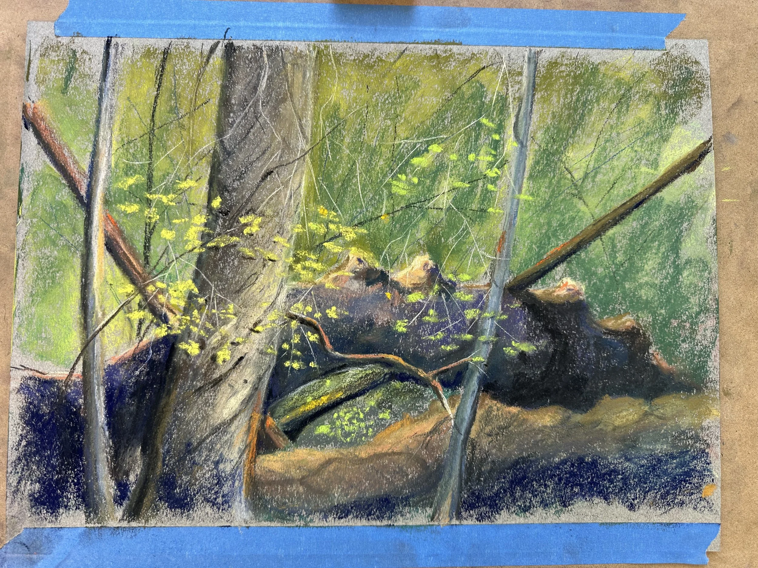 I definitely need more stark darks in my plein air setup because I kept trying to find a green that would do the job I needed it to do in the background, but I just couldn’t get there. I wanted the leaves up front that are overlapping the thick upright tree to really pop, but they aren’t getting there for me. It’s all too much in the same value range I think. I do think that this is closer to what I was actually seeing than what I wanted to see and more importantly what I wanted to show people who looked at the painting.