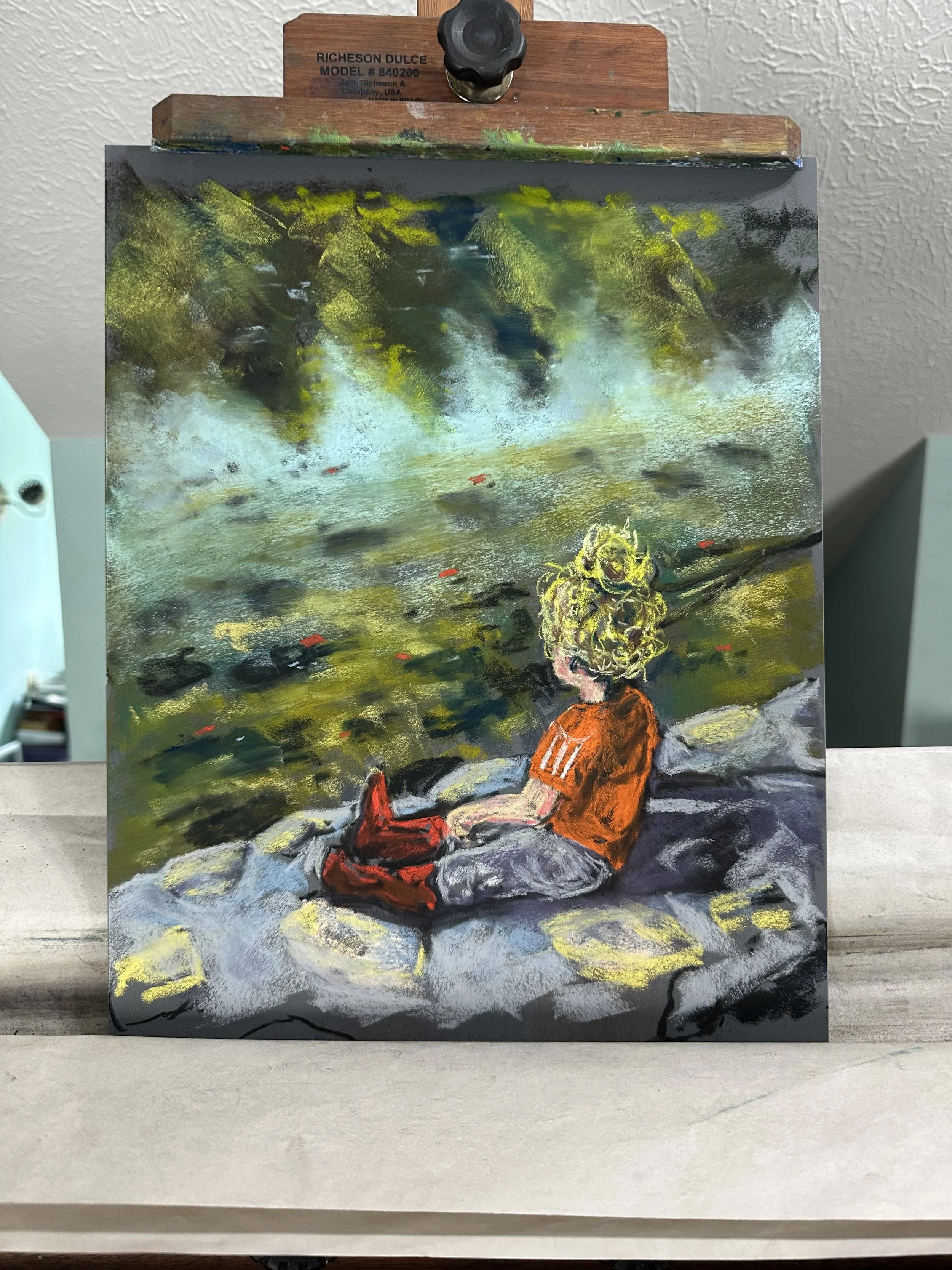 Here is a painting of my youngest daughter sitting on a rock wall beside the St Joseph River in her favorite cowgirl boots. I just wanted to mention that I will accept any donations of unison pastels that people want to send my way.