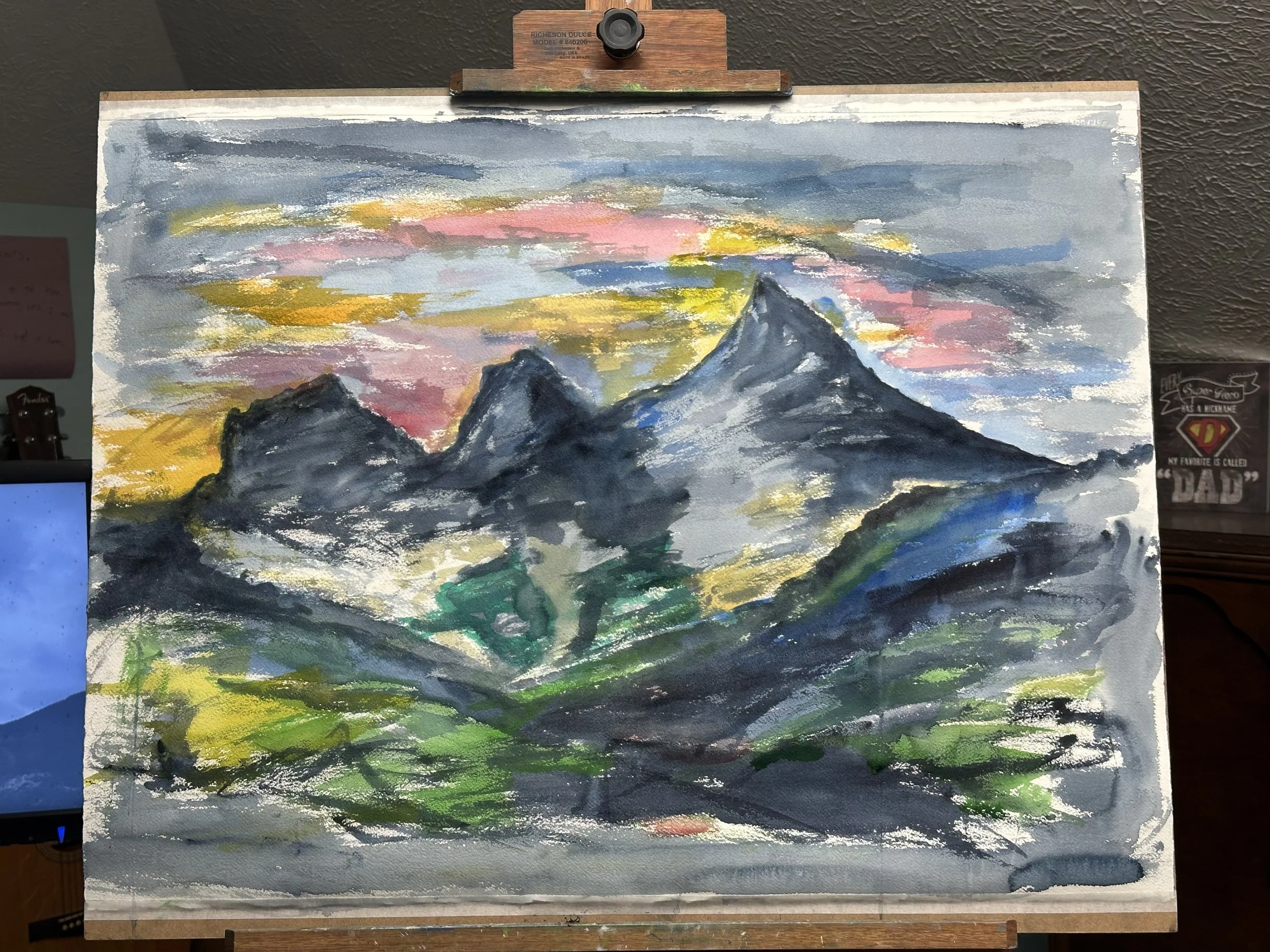 Here’s the first pass. So far it’s all watercolor. I may gesso and pastel over top to do some cloud stuff depending on how it goes tomorrow.