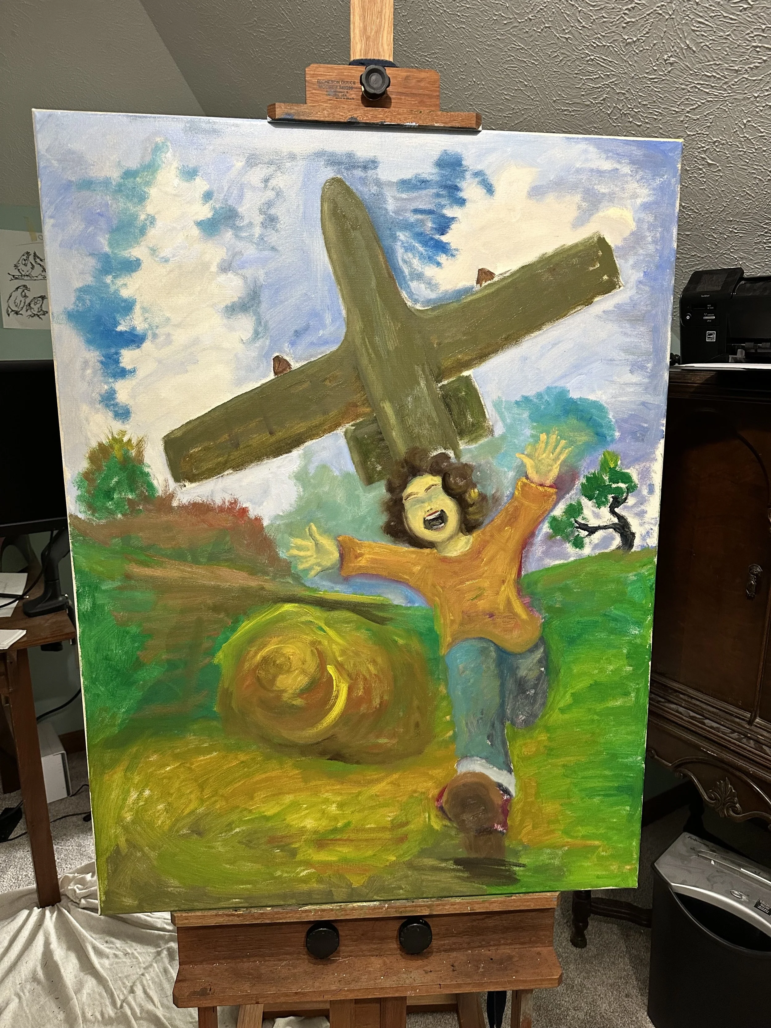 Today I think I’ll spend some more time on the Jet, trying to get it positioned farther back in space, and then possibly get some more of the golden hay colors and textures on the field behind the girl.