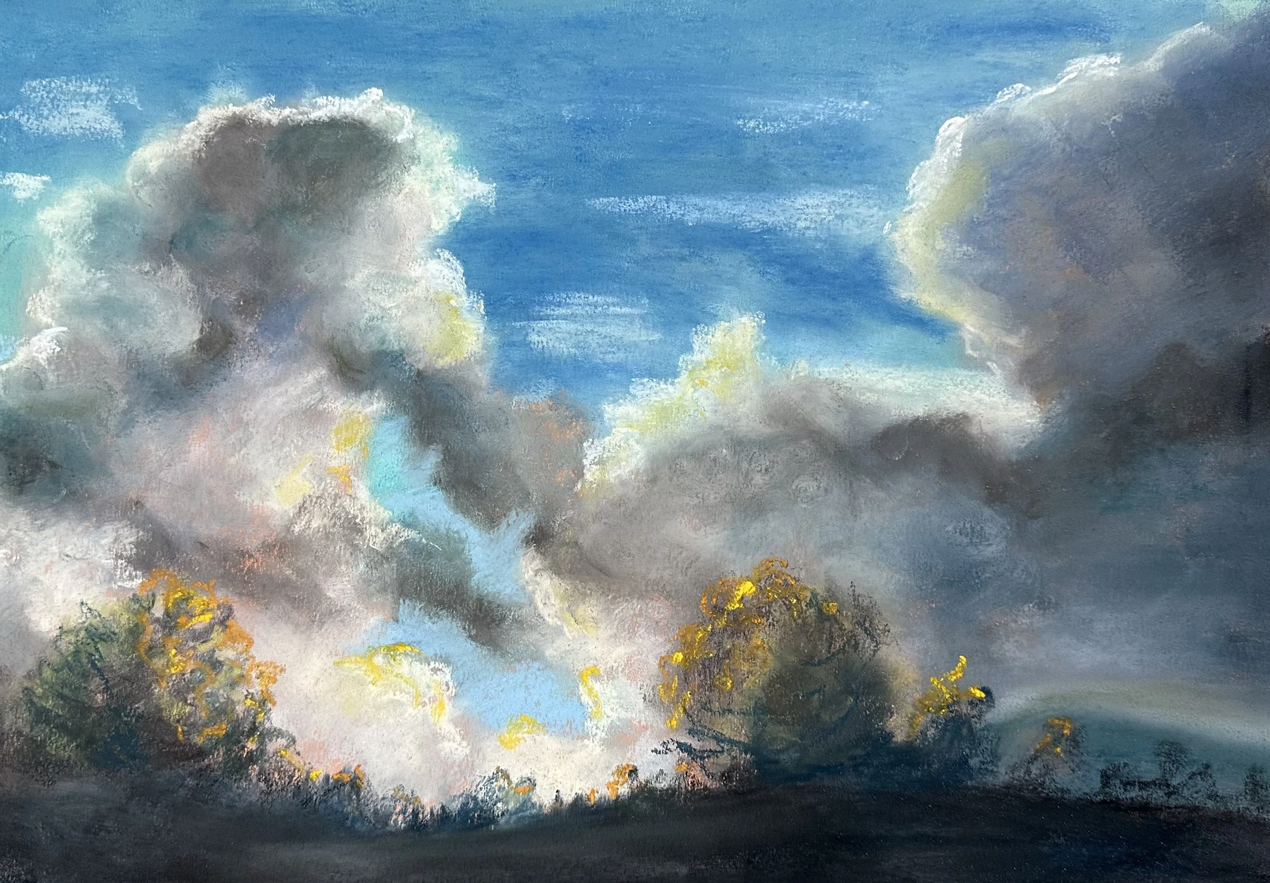 This pastel painting was based on a cloudscape that I saw on our trip to Big Sky this past summer. We weren’t there in the fall, but I wanted some fall colors in the painting, and I added those to the trees in the dark foreground.